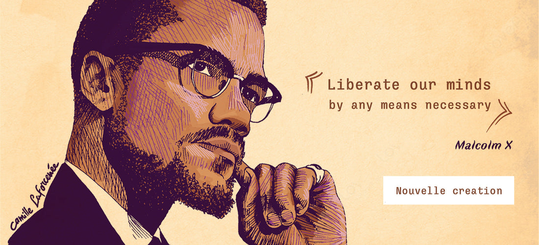2025 marque le centenaire de Malcolm X. À cette occasion, United Souls poursuit son hommage aux grandes figures des luttes pour la justice et l’émancipation avec une nouvelle création inédite de la collection : le visage puissant et déterminé de Malcolm X, illustré par Camille Laforcenée, artiste engagée déjà à l'origine de notre portrait de James Baldwin.