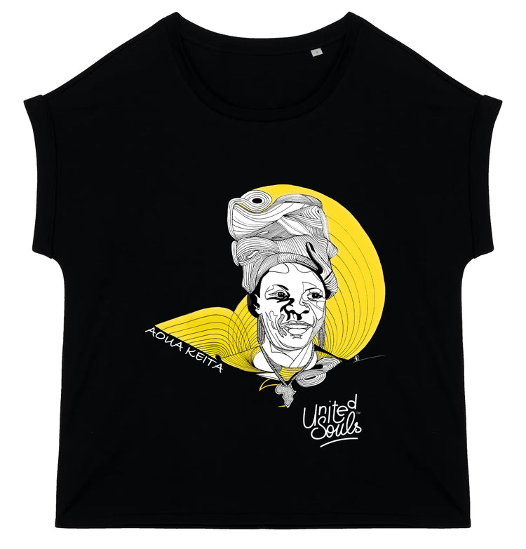 A drawing by the artist Afi Kodjobi Tchoukpa Material: 100% organic ring-spun and combed cotton Cut: Loose / Weight: 155 G/M² PIONEER OF AFRICAN WOMEN'S EMANCIPATION AOUA KEÏTA 1912-1980 - MALI Born in 1912 in Bamako, Aoua Keita was the first midwife in her country. Assigned to Gao in 1931, she secured the opening of a