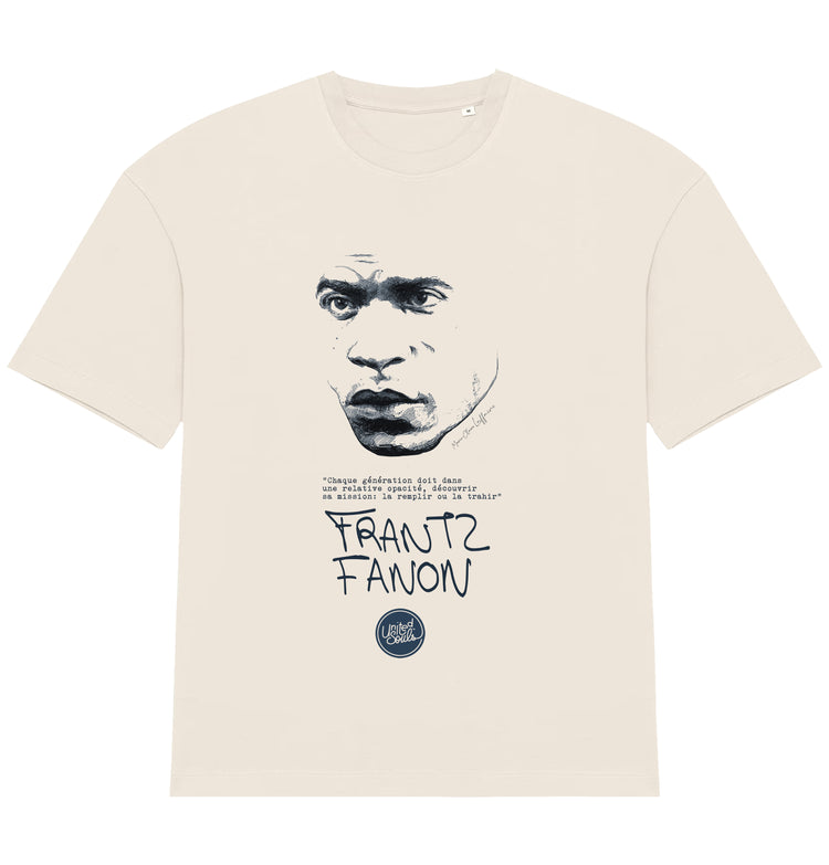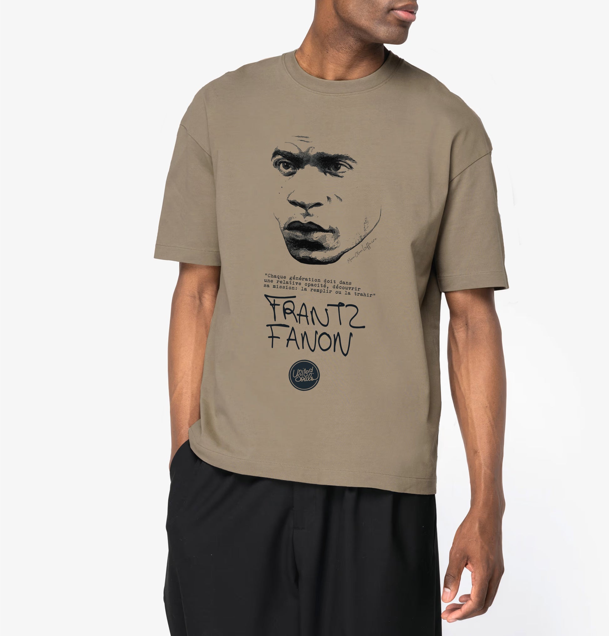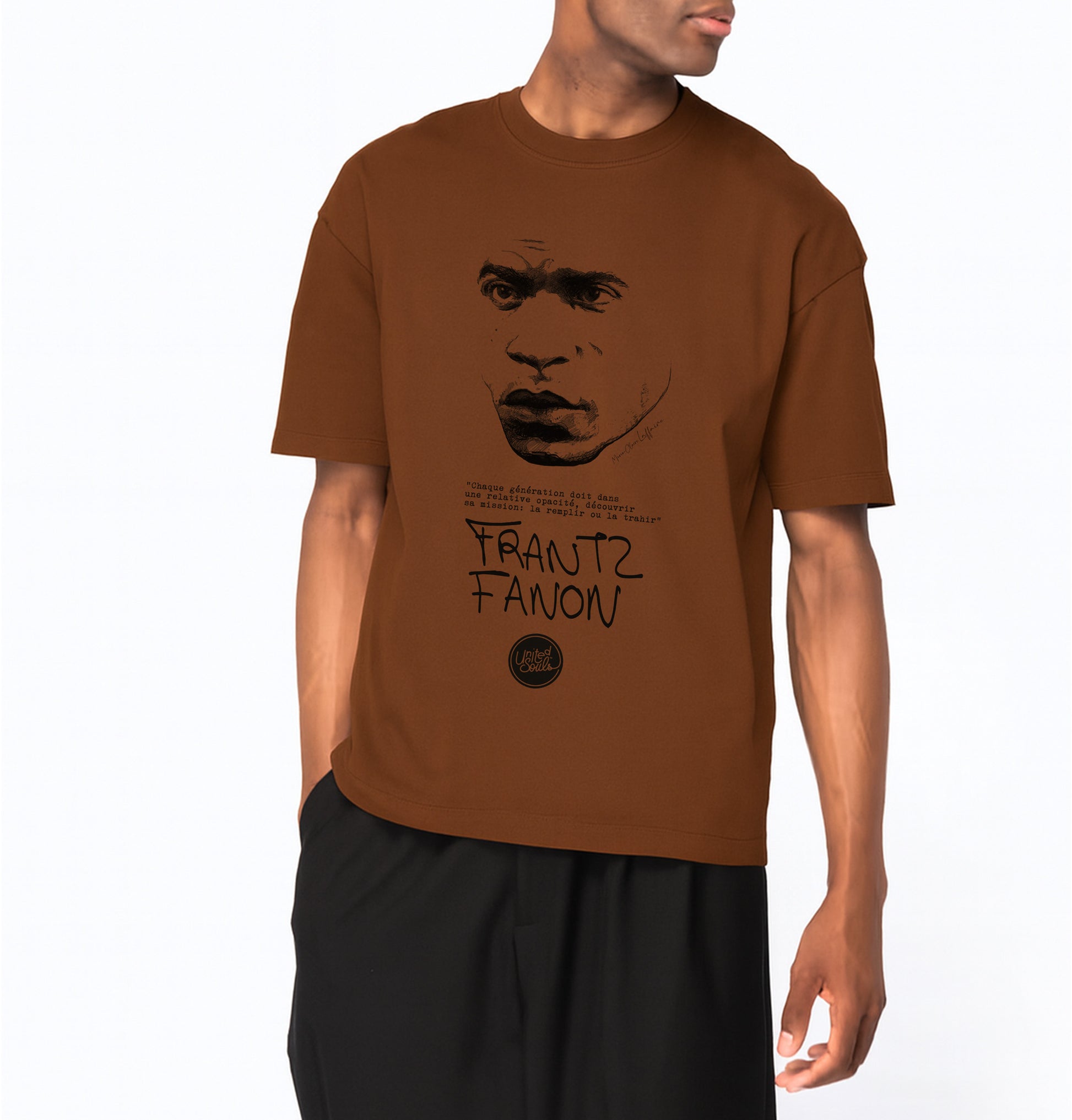 A drawing by portrait artist Marie-Claire Laffaire Material: 100% organic cotton Cut: oversize / Weight: 220 G/M² THE ANTICOLONIAL PSYCHIATRIST FRANTZ FANON (1925-1961) - MARTINIQUE Born in Martinique, Frantz Fanon was one of the great voices of the anti-colonial struggle. A psychiatrist by training, he directed the Bl