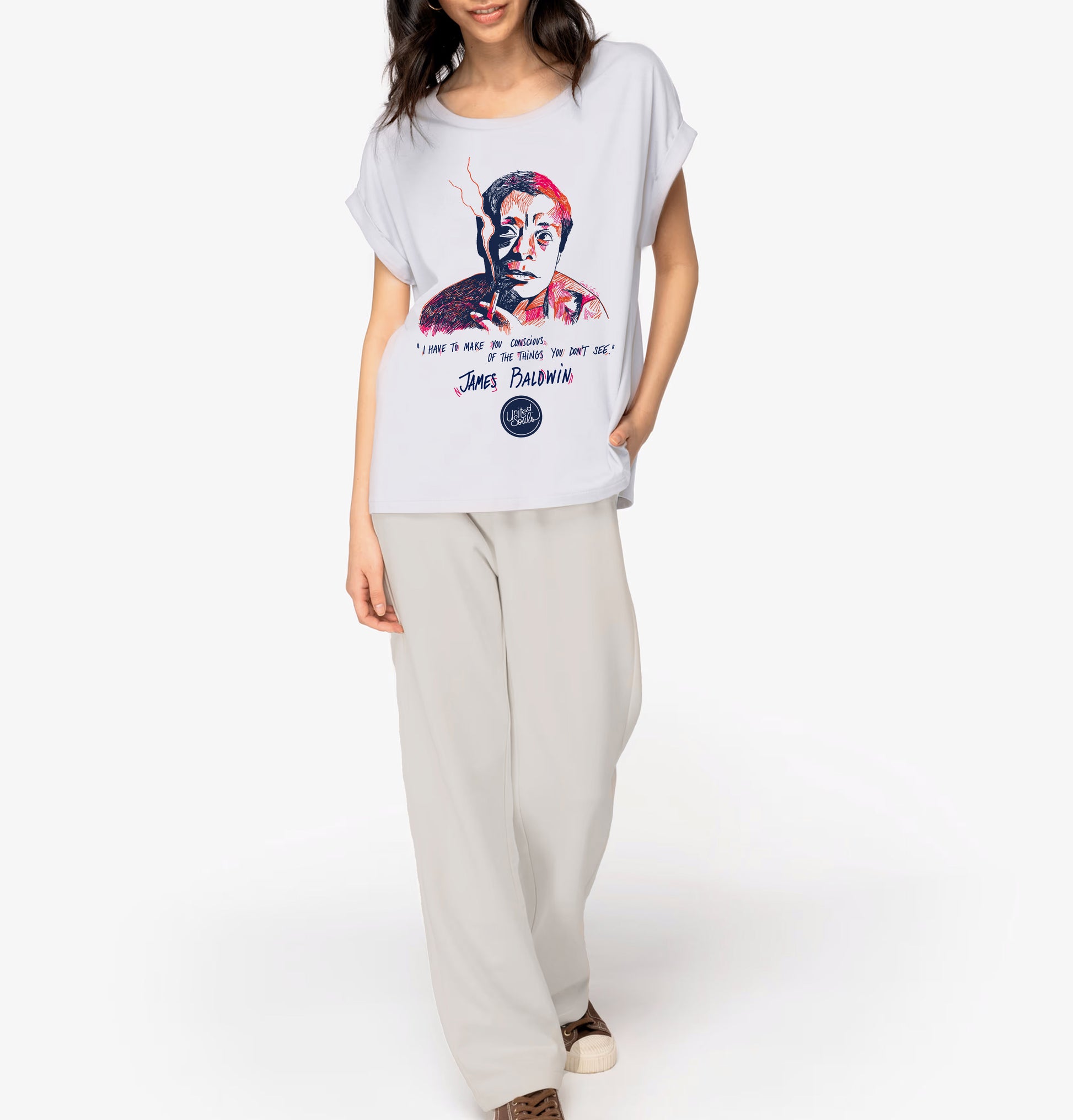 A drawing by the artist Camille Laforcenée Material: 100% organic ring-spun and combed cotton Cut: Loose / Weight: 155 G/M² NOBODY'S NIGGER JAMES BALDWIN (1924-1987) - UNITED STATES James Baldwin is a writer, author of novels, poetry, short stories, plays and essays. Suffering from racism and police violence in segrega