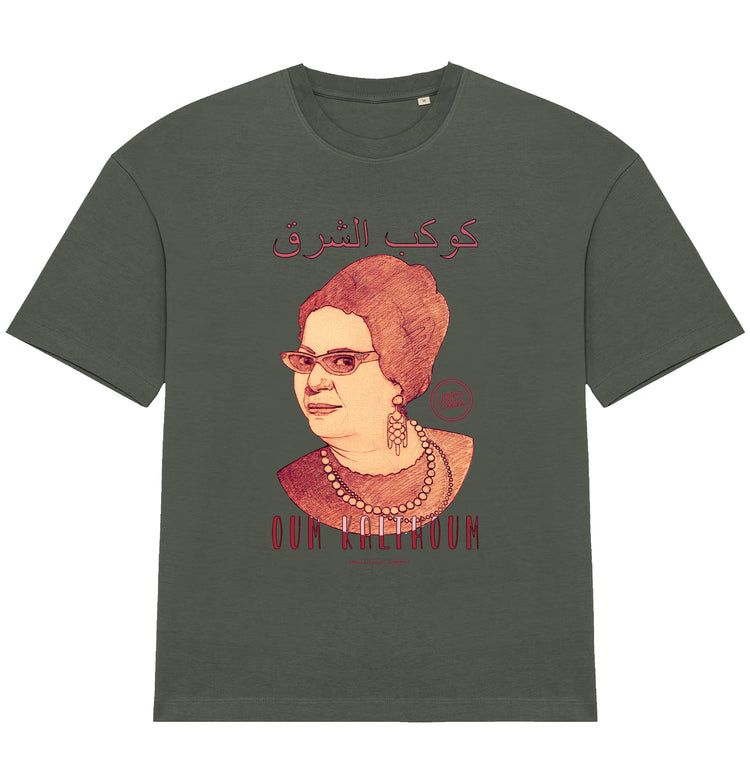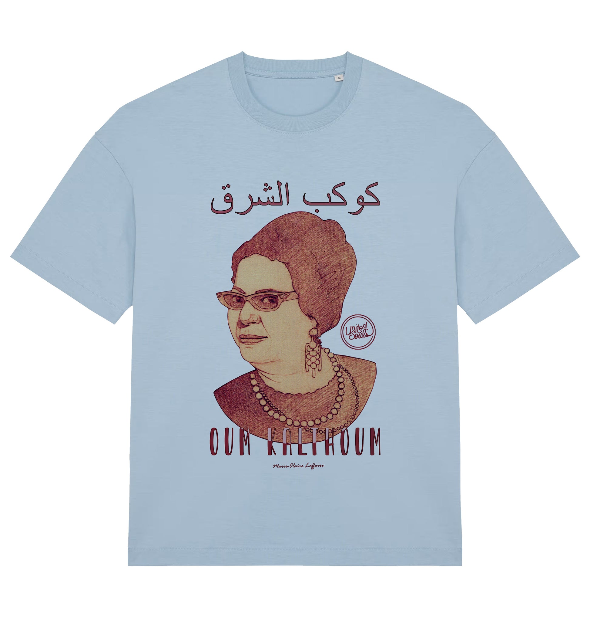 A creation by the artist Marie-Claire Laffaire Material: 100% organic cotton Cut: oversize / Weight: 180 G/M² THE VOICE OF ARAB UNITY AND IDENTITY OUM KALTHOUM (approximate date 1902-1975) - EGYPT Oum Kalthoum, nicknamed "the Star of the Orient," "the Diva," the "People's Singer," the "Nightingale of the Nile," or the