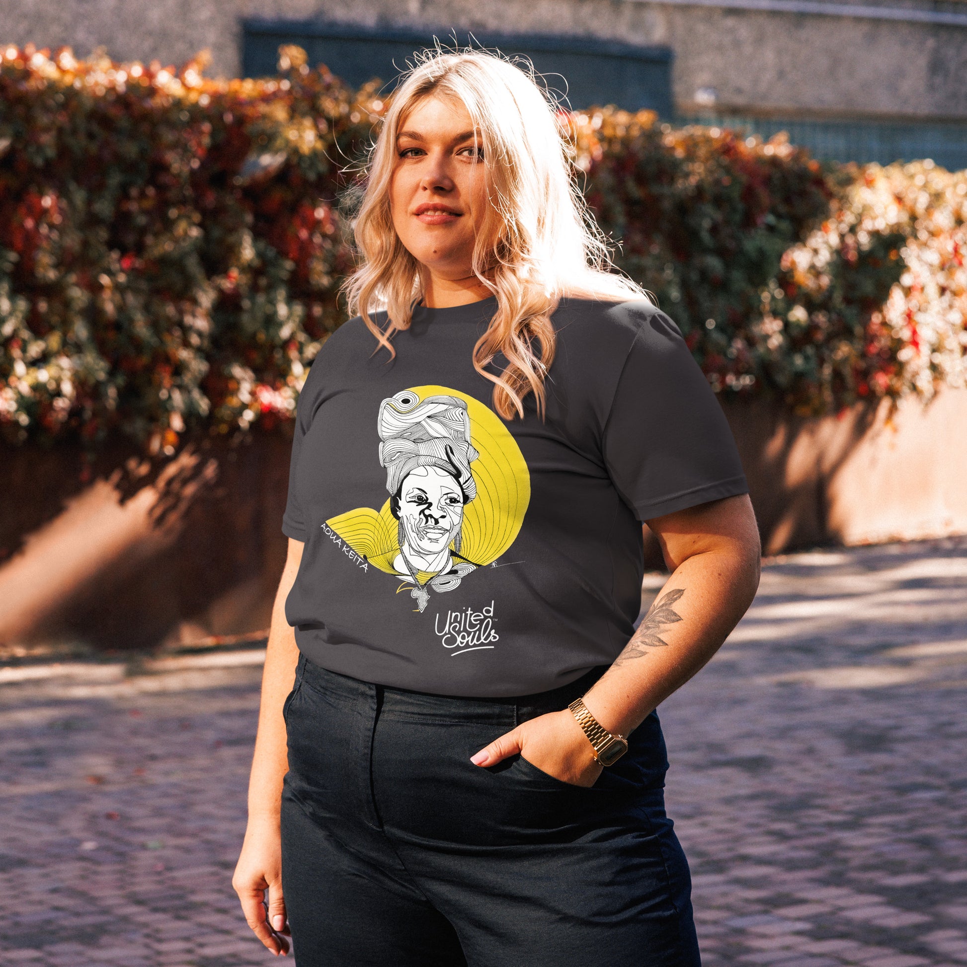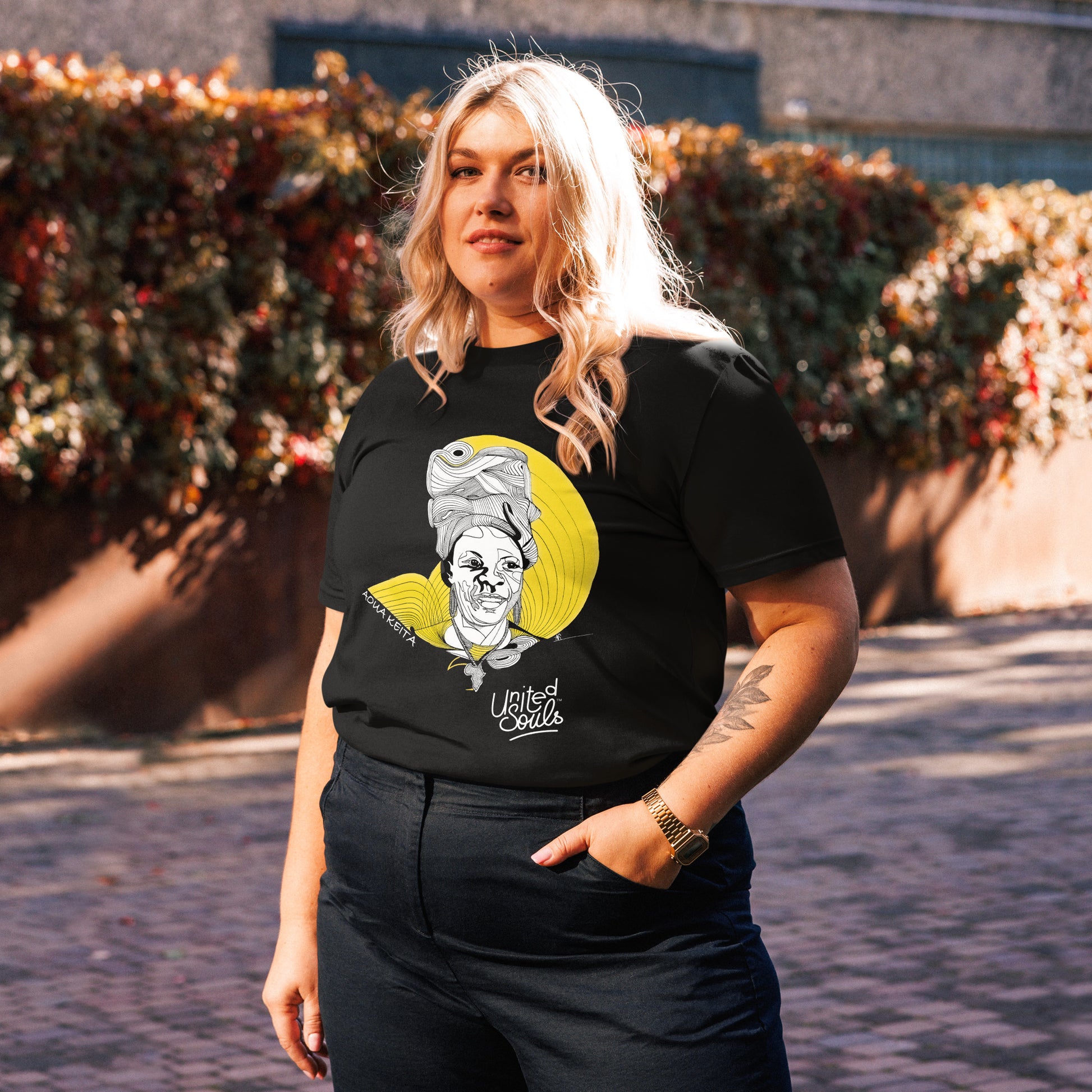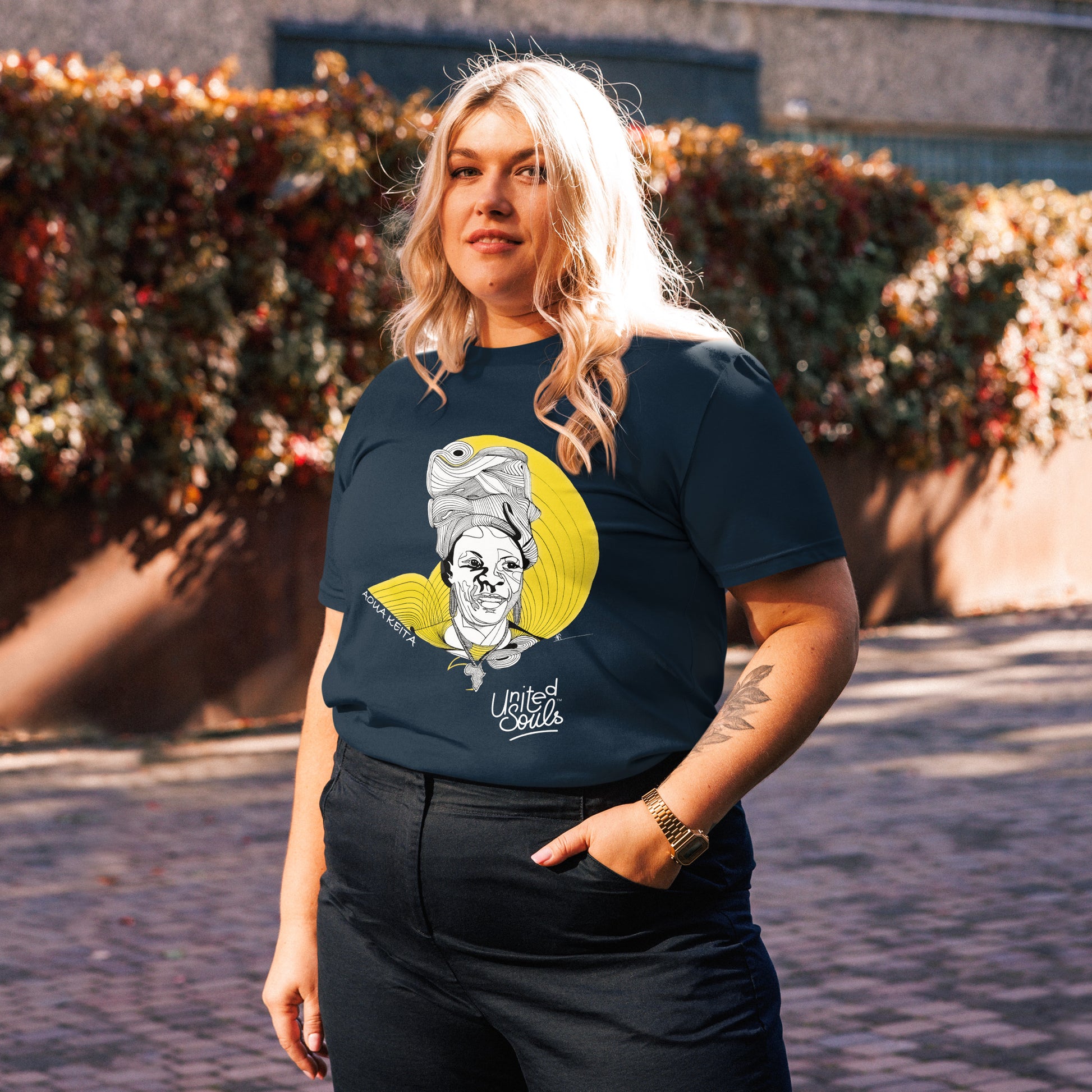 A creation by the artist Afi Kodjobi Tchoukpa Material: 100% organic cotton Cut: Normal / Weight: 180 G/M² PIONEER OF AFRICAN WOMEN'S EMANCIPATION AOUA KEÏTA 1912-1980 - MALI Born in 1912 in Bamako, Aoua Keita was the first midwife in her country. Assigned to Gao in 1931, she secured the opening of a maternity hospital