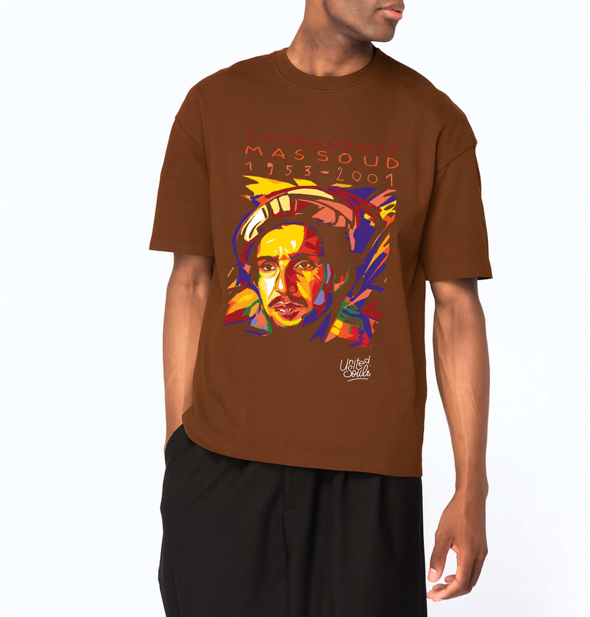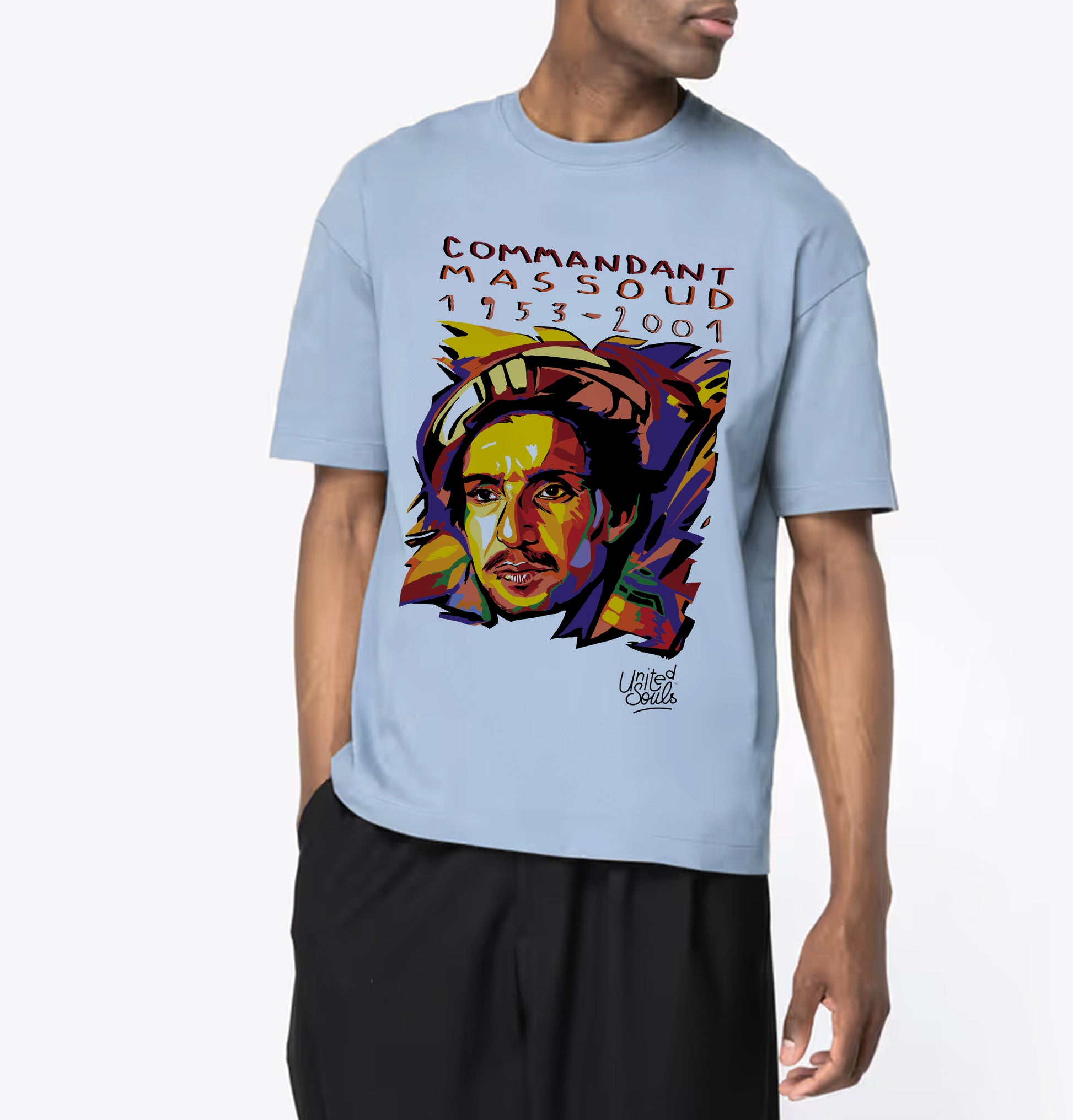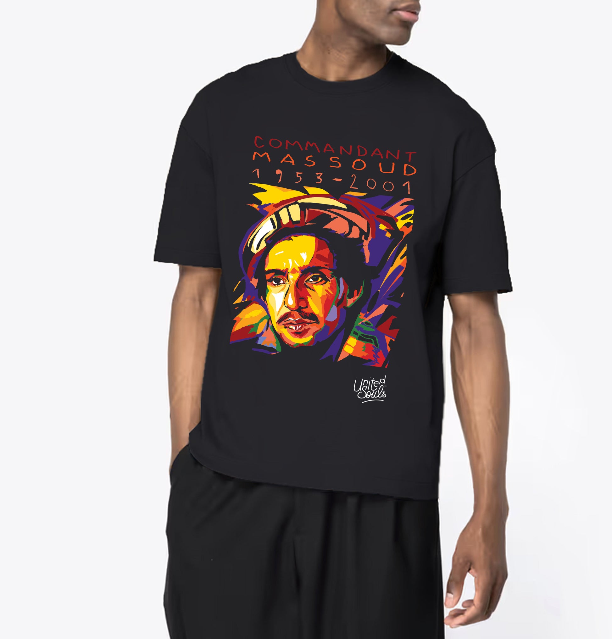 Une création de l'artiste Joy Hanoun Matière : 100% coton biologique Coupe : oversize / Grammage : 220 G/M² LE LION DU PANSHIR AHMED SHAH MASSOUD (1953-2001) - AFGHANISTAN Ahmad Shah Massoud, né le 2 septembre 1953 en Afghanistan, était un commandant militaire et homme politique afghan. Surnommé le "Lion du Panchir", i
