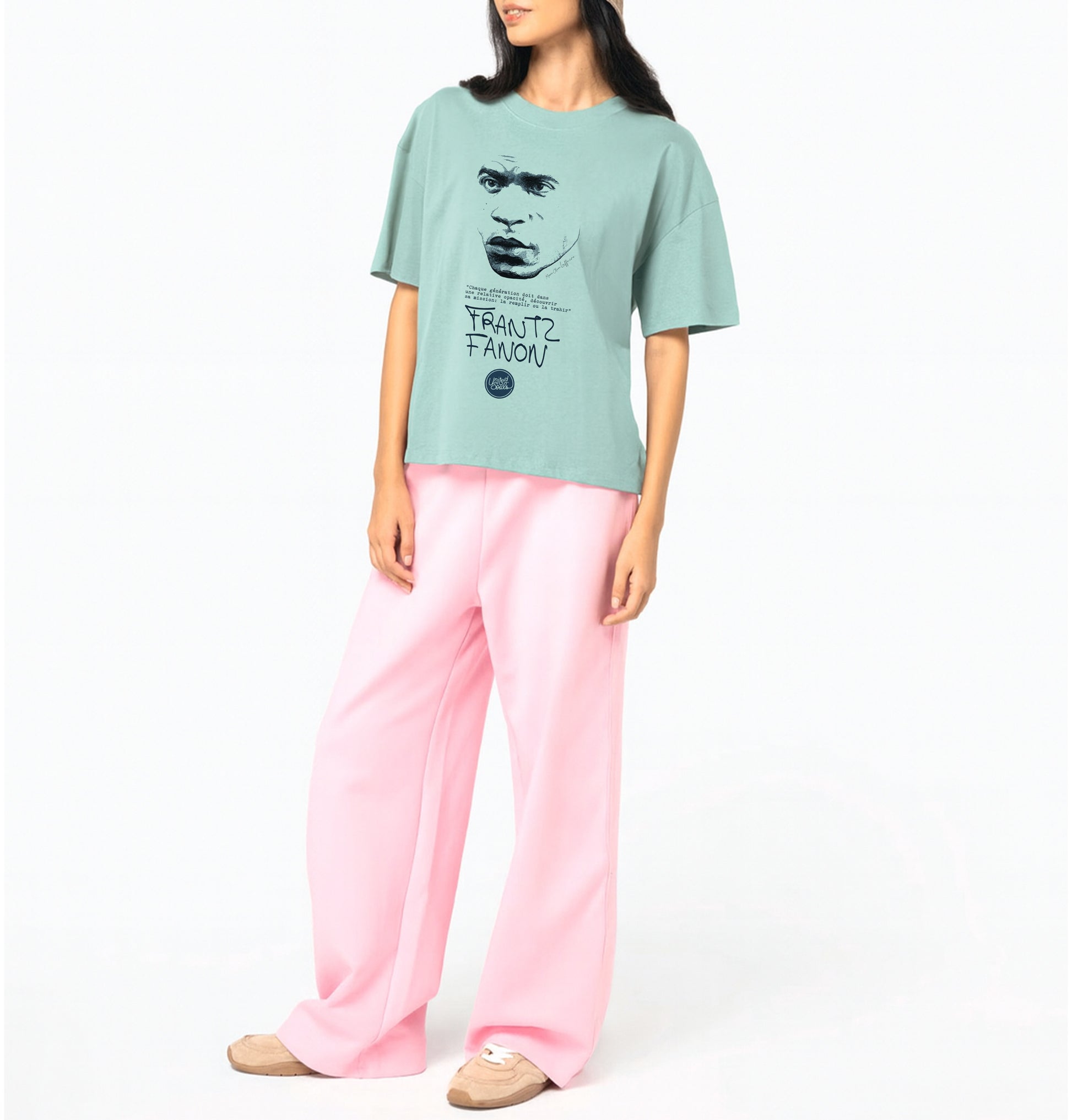 Un dessin de l'artiste portraitiste Marie-Claire Laffaire Matière : 100% coton biologique Coupe : oversize / Grammage : 180 G/M² LE PSYCHIATRE ANTICOLONIAL FRANTZ FANON (1925-1961) - MARTINIQUE Né en Martinique, Frantz Fanon fut l’une des grandes voix de la lutte anticoloniale. Psychiatre de formation, il dirige l’hôpi