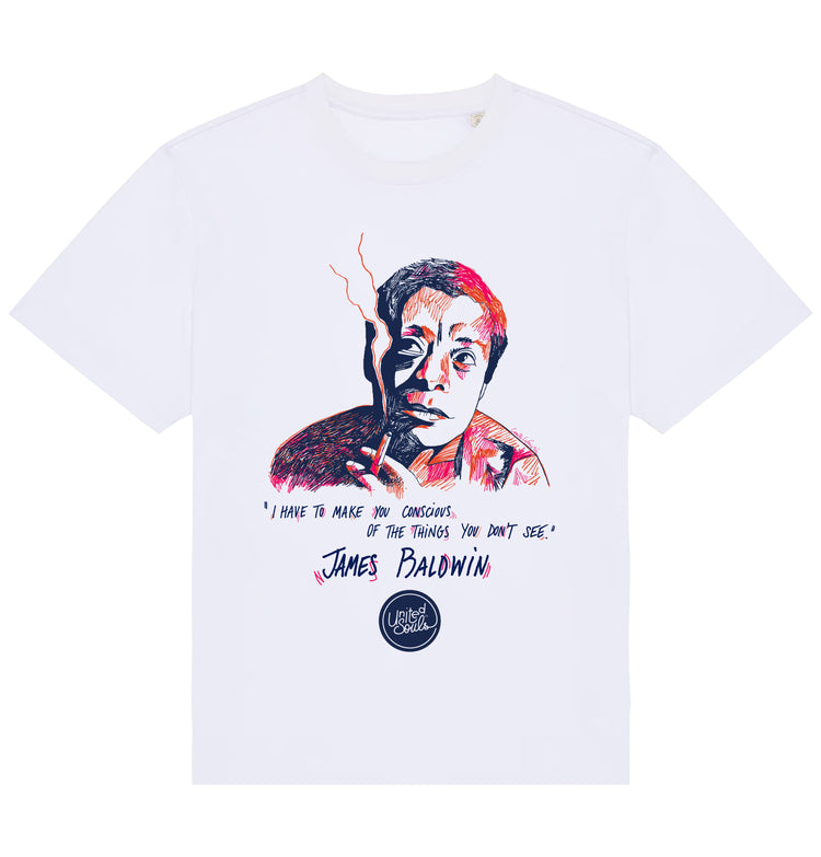 Une création de l'artiste Camille Laforcenée Matière : 100% coton biologique Coupe : oversize / Grammage : 220 G/M² LE NÈGRE DE PERSONNE JAMES BALDWIN (1924-1987) - ÉTATS-UNIS James Baldwin est un écrivain, auteur de romans, de poésies, de nouvelles, de pièces de théâtre et d’essais. Subissant le racisme et les violenc