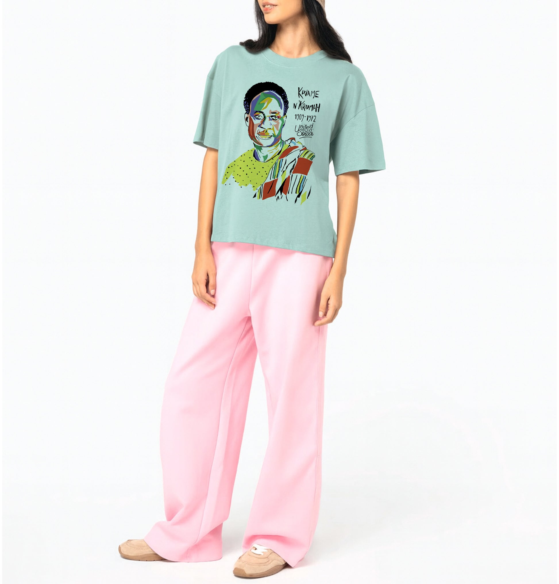 Une création de l'artiste Joy Hanoun Matière : 100% coton biologique Coupe : oversize / Grammage : 180 G/M² LE THÉORICIEN DU PIONNIER DU PANAFRICANISME ET DE L'INDÉPENDANCE AFRICAINE KWAME NKRUMAH 1909-1972 GHANA Kwame Nkrumah, leader emblématique de la lutte pour l’indépendance du Ghana et visionnaire panafricain, a m