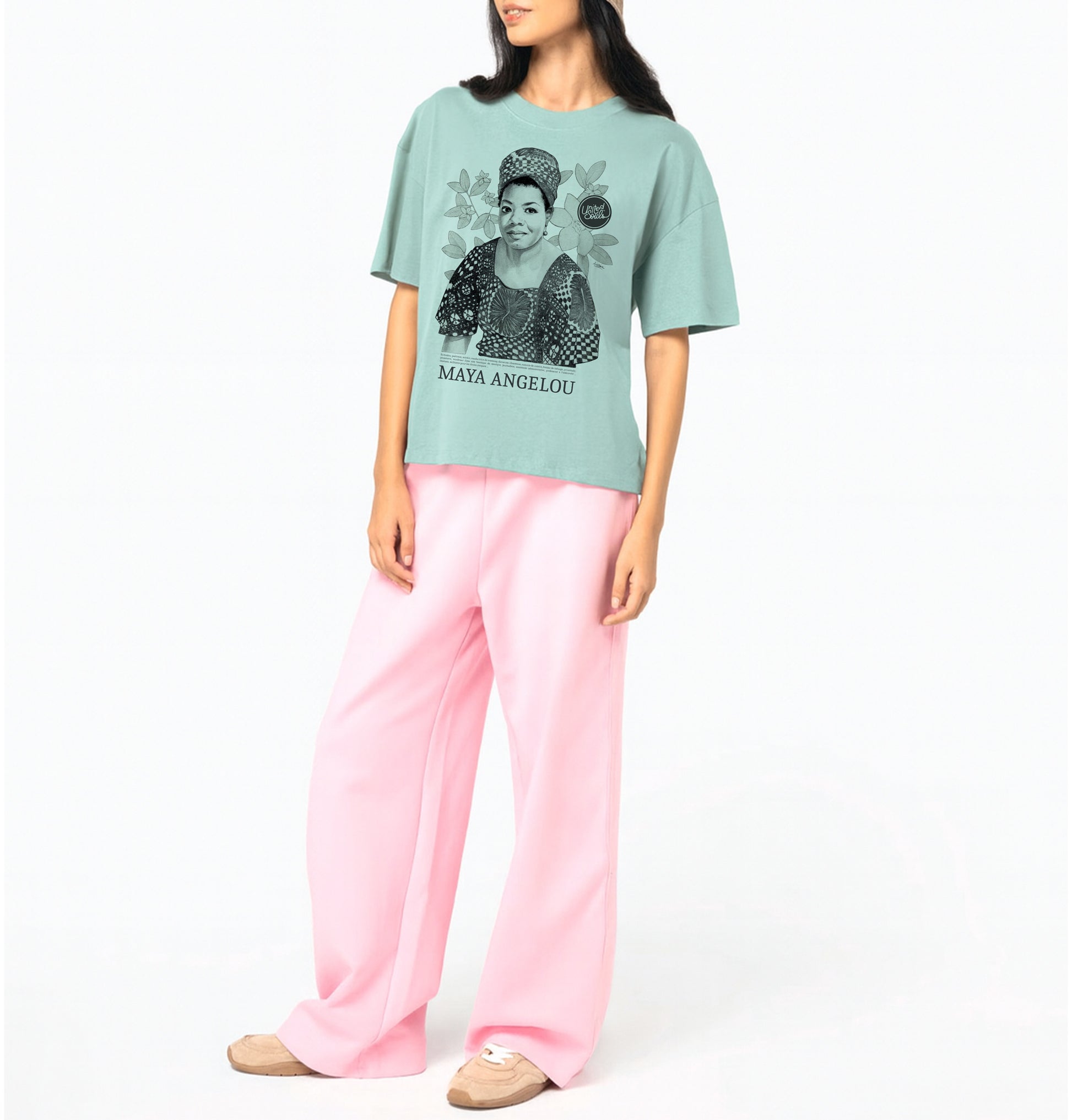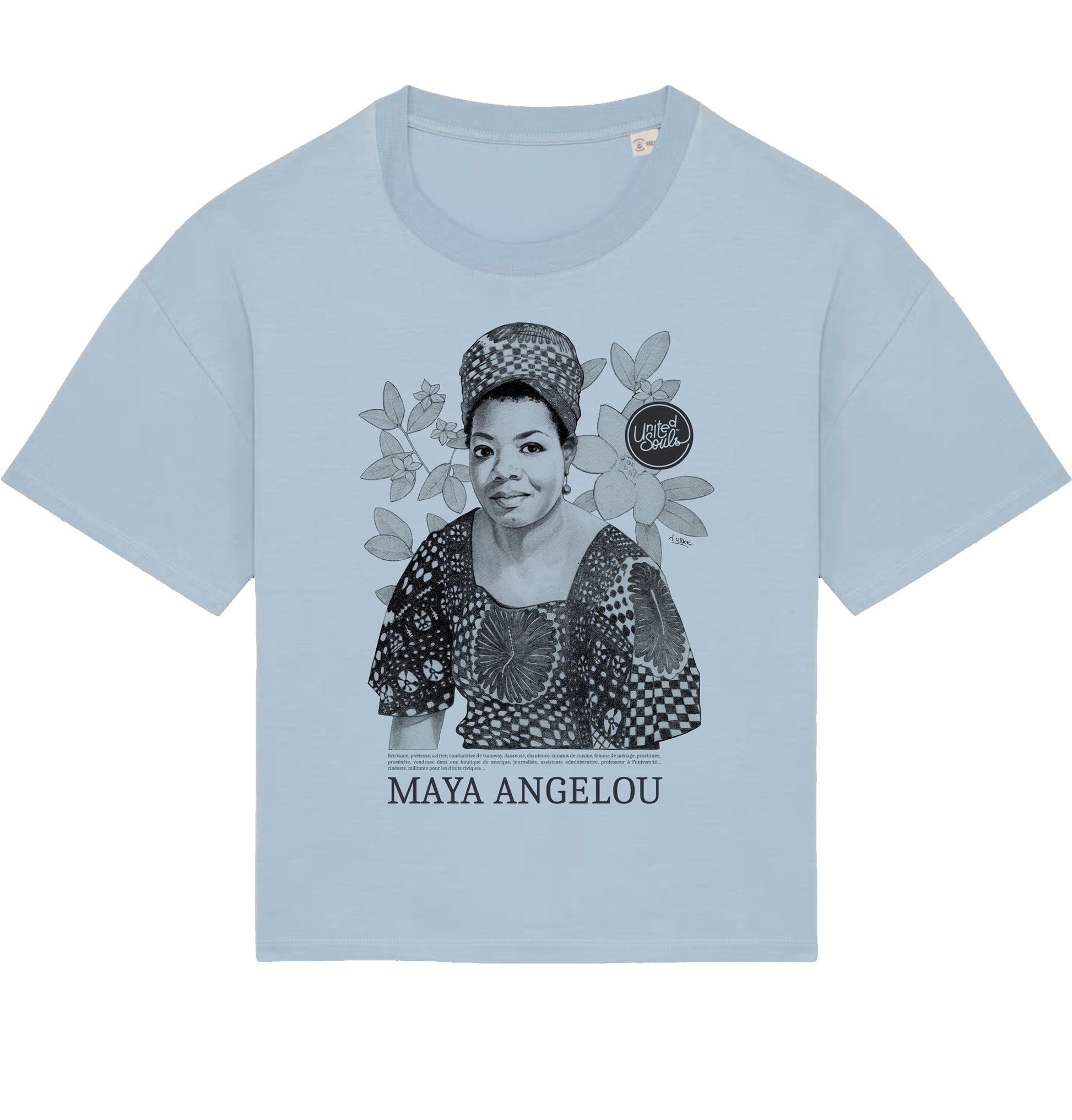 Un dessin de l'artiste portraitiste Marie-Claire Laffaire Matière : 100% coton biologique Coupe : oversize / Grammage :180 G/M² LA POETESSE COMBATTANTE POUR LES DROITS CIVIQUES MAYA ANGELOU (1928-2014) - ÉTATS-UNIS Maya Angelou est une militante, poétesse, romancière, actrice, réalisatrice et enseignante. Victime de vi