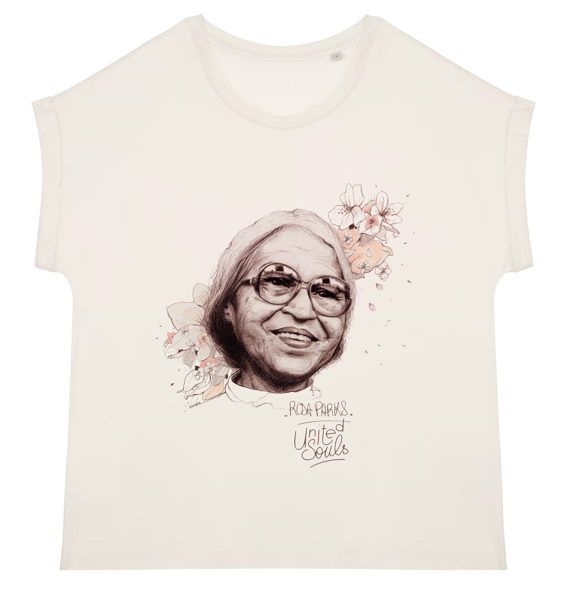 Un dessin de l'artiste Marie-Claire Laffaire Matière : 100% coton biologique filé et peigné Coupe : Loose / Grammage : 155 G/M² LA MERE DES DROITS CIVIQUES ROSA PARKS (1913-2005) - ÉTATS-UNIS Née en 1913 à Tuskegee, Alabama, Rosa Parks est une couturière afro-américaine. Avec son époux, elle milite pour l’enregistremen